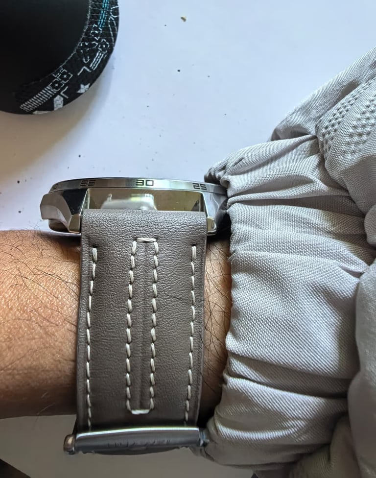 Lo primero que llama la atención del Watch GT 6 es su estética. Con una caja de acero inoxidable de 46 mm y una pantalla AMOLED circular de 1.47 pulgadas, logra un look que se acerca más a un reloj clásico que a un gadget tecnológico. La sensación en la muñeca es premium y sólida, la correa de el modelo que estoy probando es de cuero y es la opción gris, su peso de aproximadamente 51 gramos lo hace sorprendentemente cómodo para usarlo todo el día e incluso para dormir.